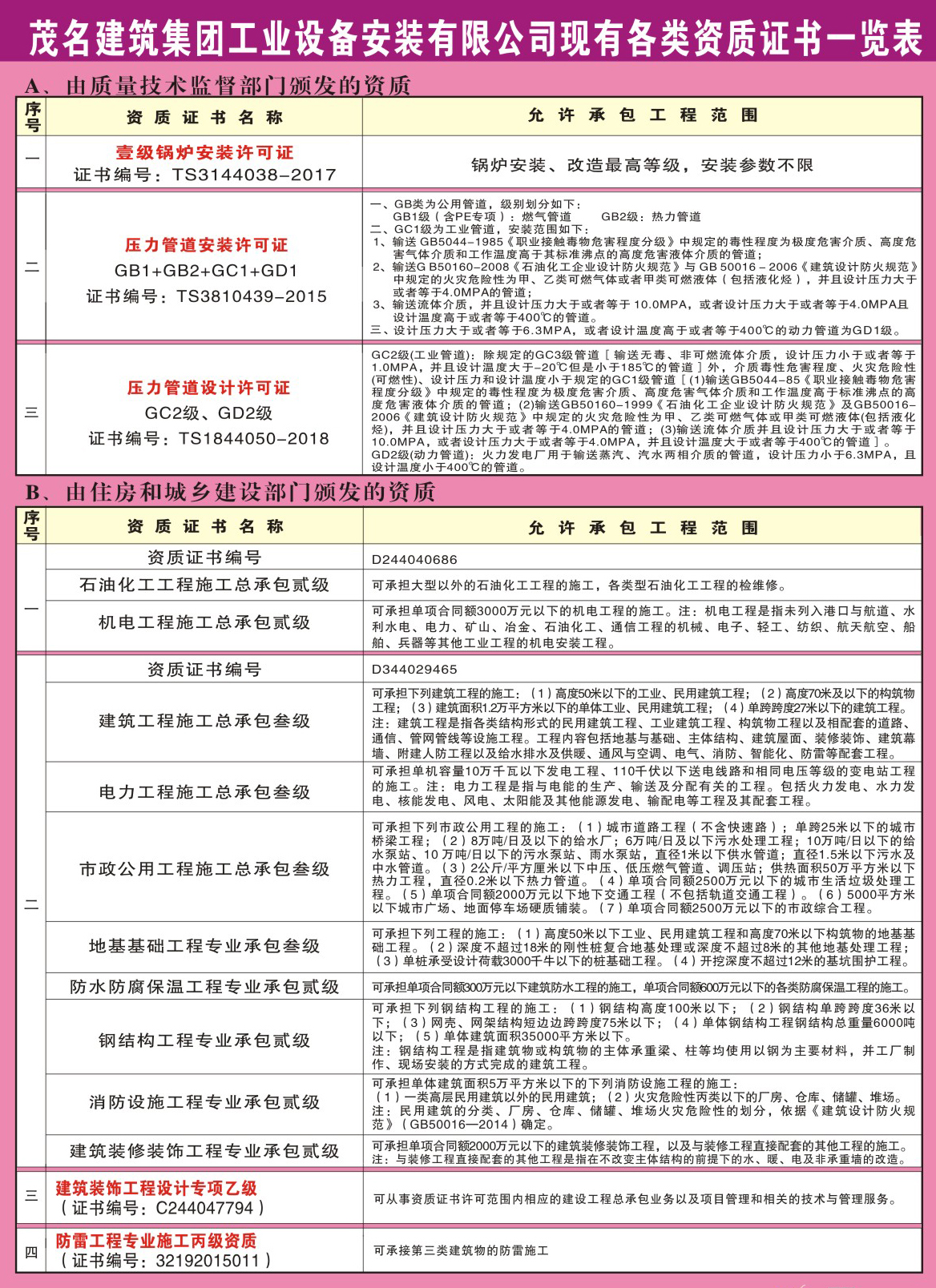 現(xiàn)有各類資質(zhì)證書、認(rèn)證證書一覽表